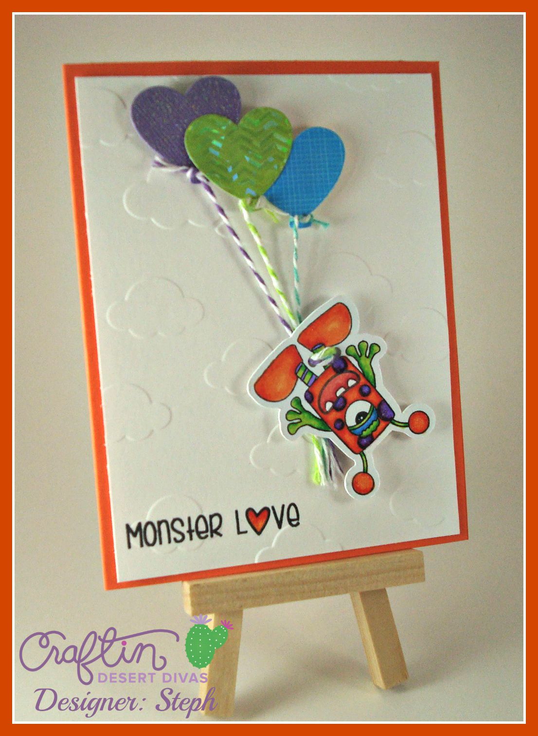 Today we are showcasing Monster Mania stamp set and Party Dies! I used both for my card!! I am so in love with both of these new items!! I also used Darice's cloud embossing folder for the background. I colored my lil monster with Bic Mark Its. I used my clear Wink of Stella glitter pen for his spots and Sew Easy Fancy Floss for the balloon strings.